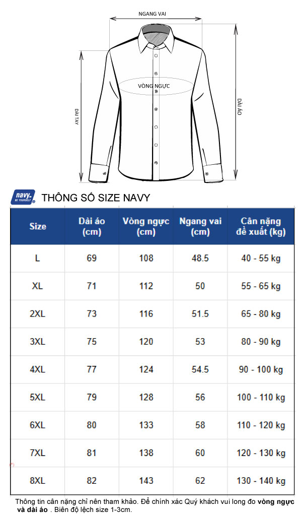Đặc biệt thiết kế để vừa vặn tối ưu và tôn dáng cho quý ông “ngoại cỡ”, chiếc áo này có dải size rộng rãi từ L đến 8XL. Thương Hiệu Navy chú trọng vào việc tạo ra form dáng thoải mái, đảm bảo sự vừa vặn lý tưởng cho người mặc Big Size mà vẫn giữ được nét lịch sự cần có.