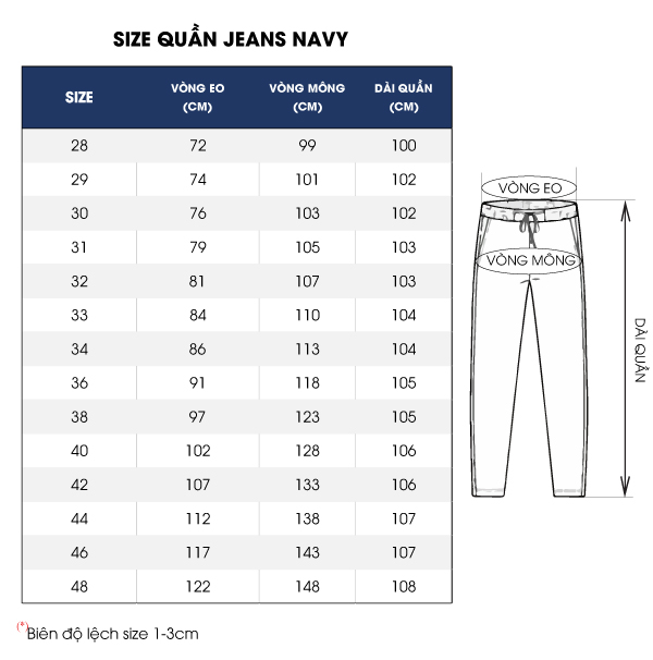 Để chọn được chiếc quần Jeans Navy BS3252 vừa vặn nhất, hãy tham khảo kỹ bảng size của nhà sản xuất và đo chính xác các số đo cơ thể. Nếu cần, đừng ngần ngại liên hệ với đội ngũ tư vấn để được hỗ trợ tận tình.